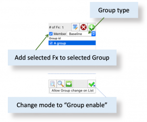 To add or remove one or more Fx from a group, select one or more Fx in the Fx Tree and one group in the group list: